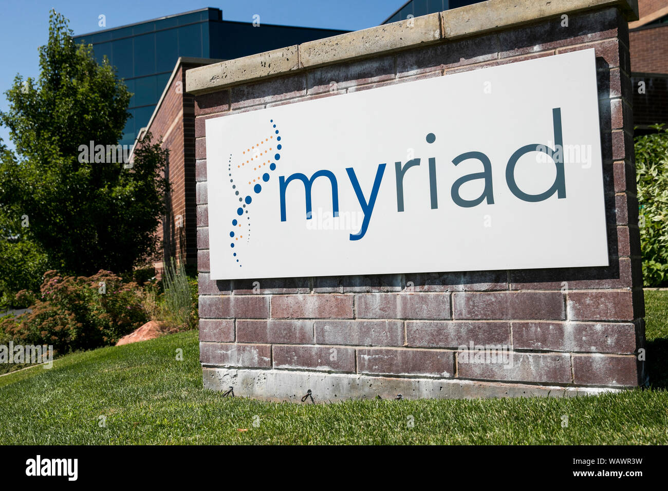 A Logo Sign Outside Of The Headquarters Of Myriad Genetics Inc In Salt Lake City Utah On July 28 2019 Stock Photo Alamy